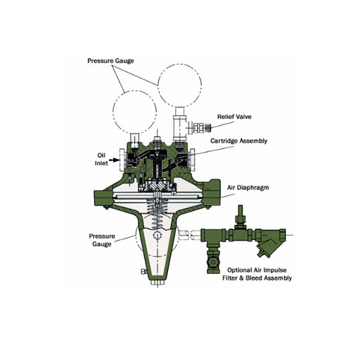 Hauck MRO oil-air ratio regulators are designed to serve as the essential control device in a cross connected oil-air delivery system. They support applications requiring wide turndown and/or low flow rates and repeatability. The MRO is engineered to function properly over a wide range of air pressures and may be used on either single or multiple burner applications. A constant oil pressure is required at the inlet of the regulator.